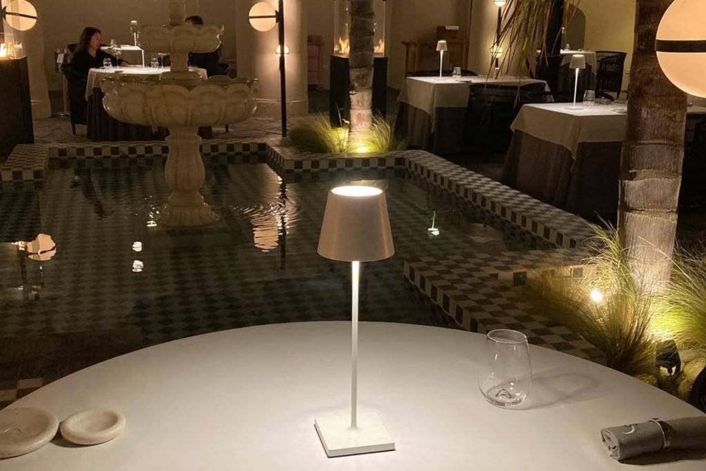 An elegant grey aluminium body with a white polycarbonate shade for atmospheric, diffused lighting. Dimmable via touch with two warm white options (2200K–2700K) and memory function—up to 90 hours on low or 7 hours bright. Perfect for open-air dining tables that see real rain, with a sleek charging station for easy top-ups.