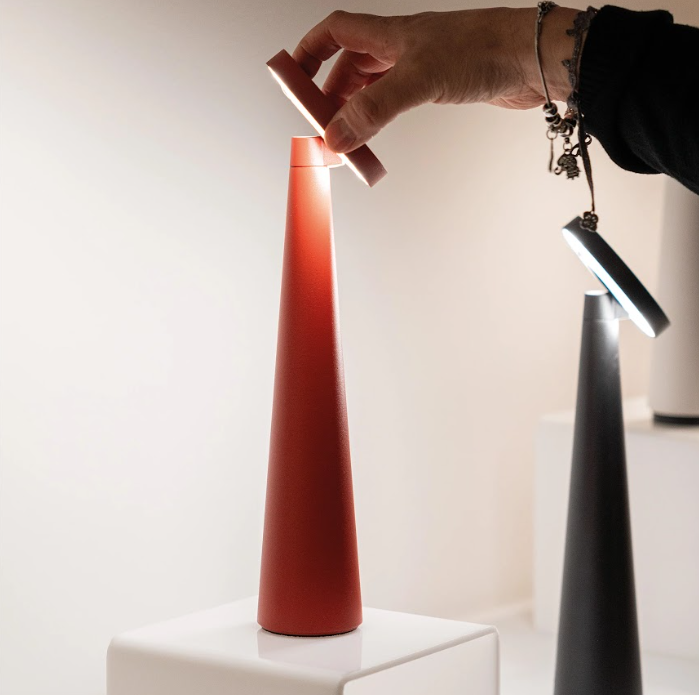 Angelina is a battery-powered, portable, and rechargeable table lamp, perfect for lighting up moments of reading, studying, or working. The adjustable head allows you to direct the light where it’s needed, making it ideal as a reading lamp for desks or bedside tables. A touch control is located on the underside of the head, allowing you to turn the lamp on and off, adjust brightness, and select the desired color temperature. The lamp is intended for indoor use only. An electronic control system monitors and displays the remaining battery life, helping optimize charging. Supplied with contact charging base; USB charger not included.