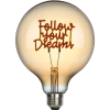 Let this inspiring LED light bulb remind you to follow your dreams every day. The lettering “Follow your Dreams” glows warmly and invitingly inside the light bulb and lends any room a special atmosphere. Whether in the bedroom, office or as a decorative eye-catcher – this light bulb is a real highlight. Thanks to the standard E27 base, the light bulb can be easily inserted into any conventional light fitting. With a service life of up to 15,000 hours, it is also environmentally friendly and efficient.