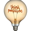 A light bulb with a motivating message: the LED filament forms the words “think positive” and illuminates your room with warm white light. This light source is the perfect choice to give yourself or others a positive boost. Create an inspiring accent in your home with this design or give it as a gift to someone you care about. Thanks to the standard E27 base, the light bulb can be easily inserted into any conventional light fitting. With a lifespan of up to 15,000 hours, it is also environmentally friendly and efficient.