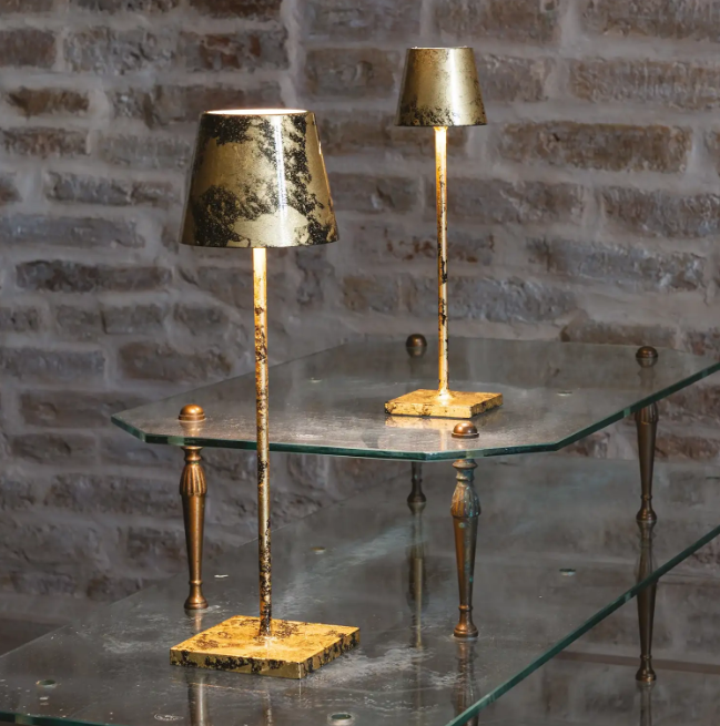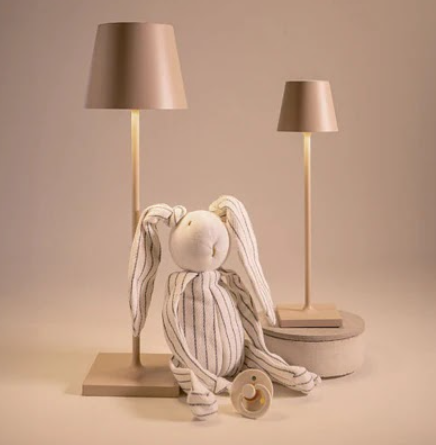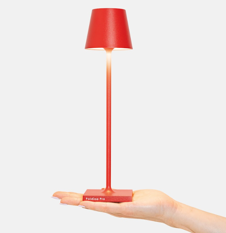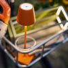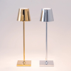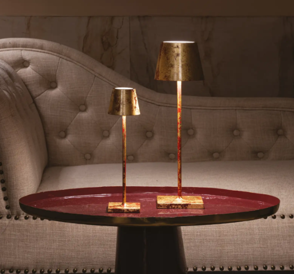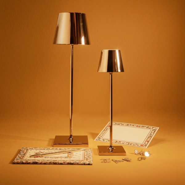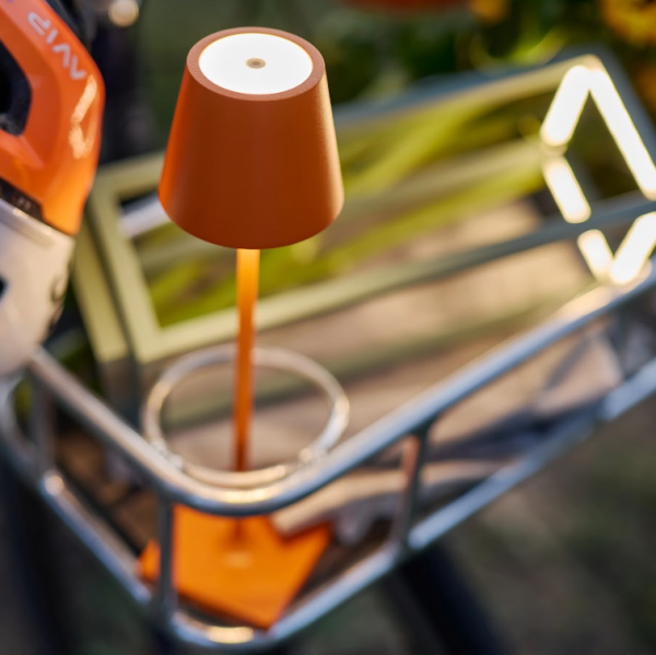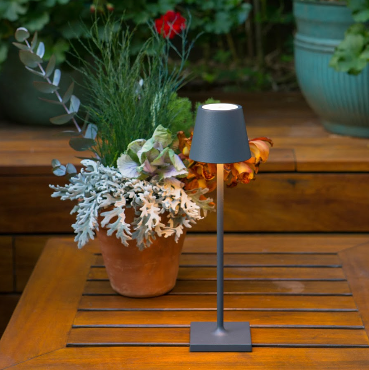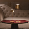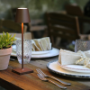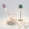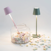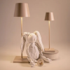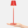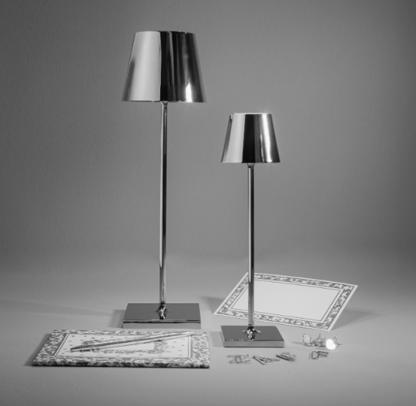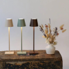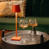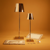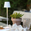 Cordless, rechargeable, battery table lamp. A touch control on the top of the lamp head allows you to switch the light on, adjust its intensity and select its color temperature. And thanks to its high IP rating, the lamp can also be used outdoors (except for the models with a galvinized finish that are not recommended for continuous outdoor use). An electronic control system monitors and indicates the remaining battery power to ensure recharging is optimized and always performed correctly. The lamp comes with a contact charging base. Battery charger not included.