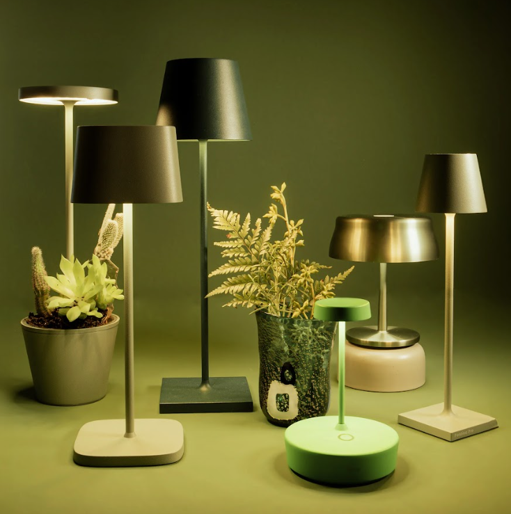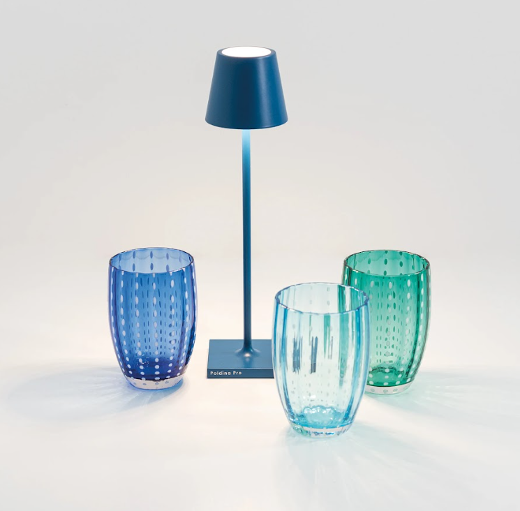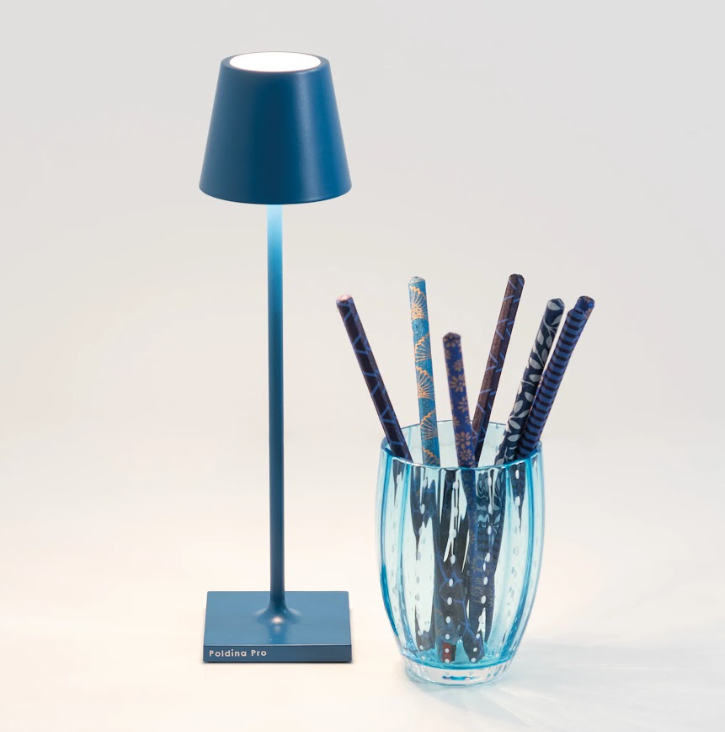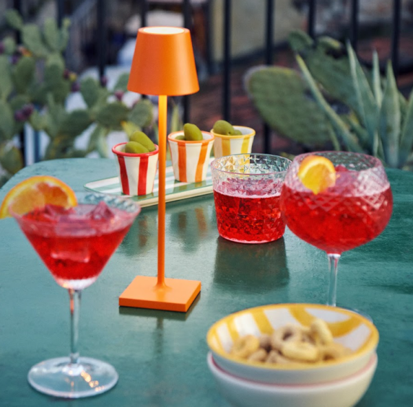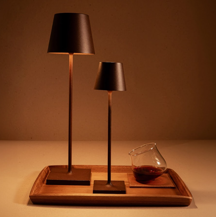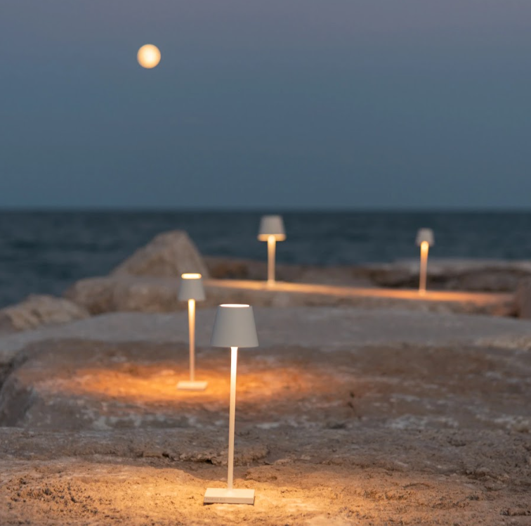 Cordless, rechargeable, battery table lamp. A touch control on the top of the lamp head allows you to switch the light on, adjust its intensity and select its color temperature. And thanks to its high IP rating, the lamp can also be used outdoors (except for the models with a galvinized finish that are not recommended for continuous outdoor use). An electronic control system monitors and indicates the remaining battery power to ensure recharging is optimized and always performed correctly. The lamp comes with a contact charging base. Battery charger not included.