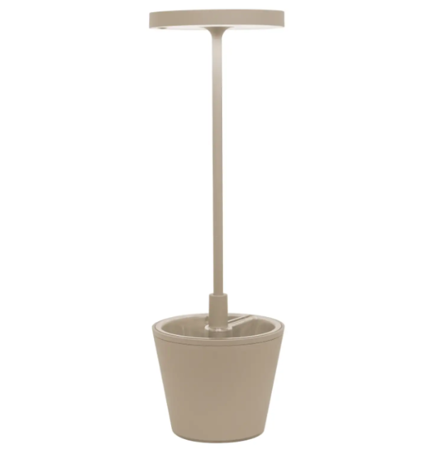 Cordless, rechargeable, battery table lamp with multipurpose, food safe container. A touch control on the lower part of the lamp head allows you to switch the light on, adjust its intensity and select its color temperature. And thanks to its high IP rating, the lamp can also be used outdoors. The multipurpose container (capacity 18cl) is made of thermoplastic resin (PET) and therefore food safe, and can be removed and reused. An electronic control system monitors and indicates the remaining battery power to ensure recharging is optimized and always performed correctly. The lamp comes with a contact charging base. USB charger included.The lamp can be customized with a ceramic cover that can be purchased separately.