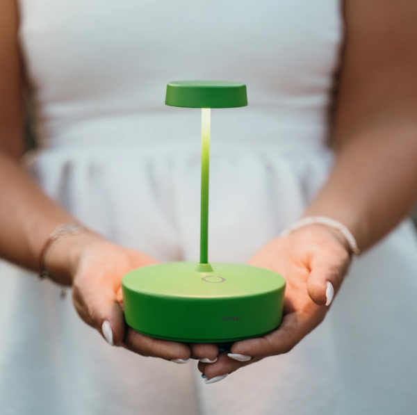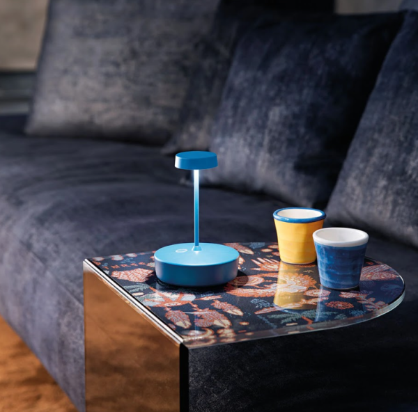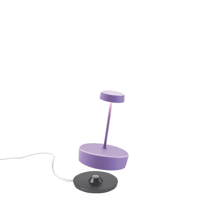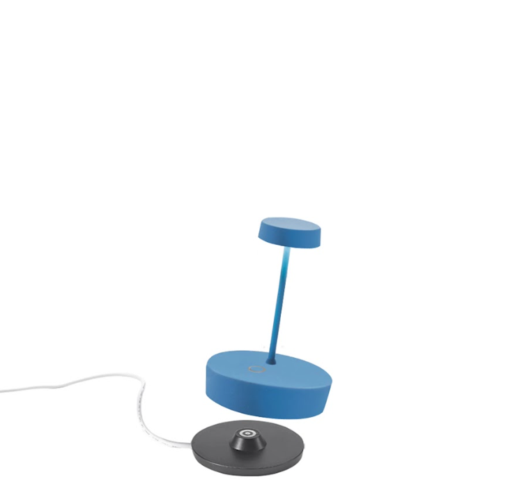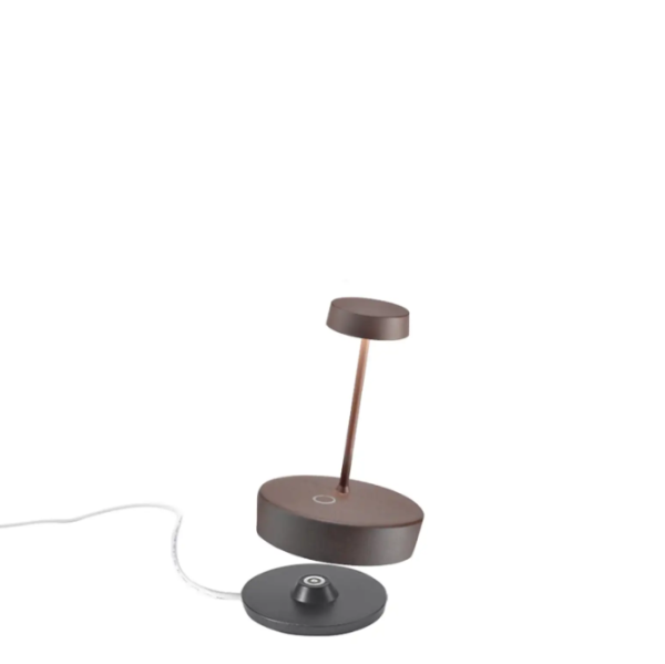 Cordless, rechargeable, battery table lamp. A touch control on the base allows you to switch the light on and adjust its intensity. And thanks to its high IP rating, the lamp can also be used outdoors (except for the models with a galvinized finish that are not recommended for continuous outdoor use). An electronic control system monitors and indicates the remaining battery power to ensure recharging is optimized and always performed correctly. The lamp comes with a contact charging base. Battery charger not included.The lamp can be customized with a ceramic cover that can be purchased separately.