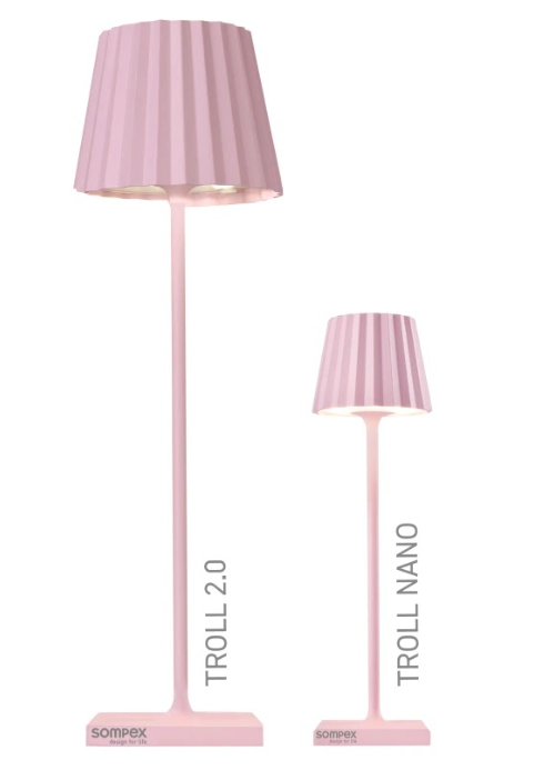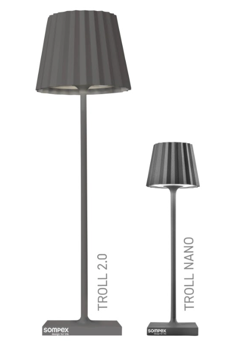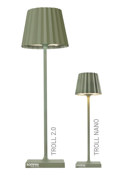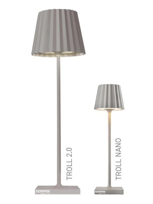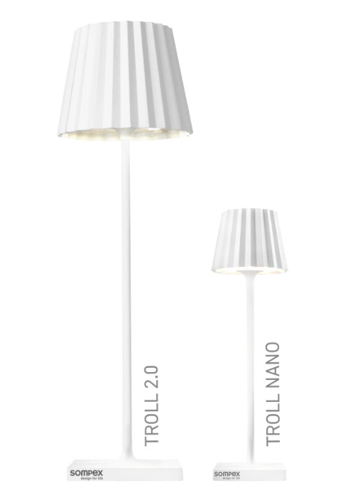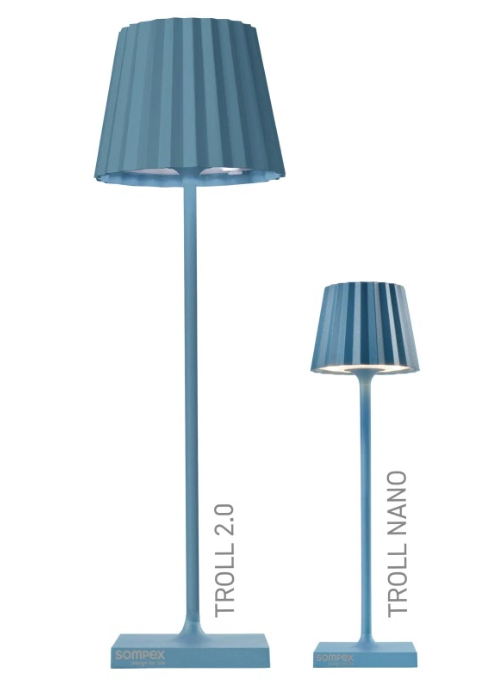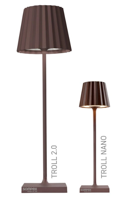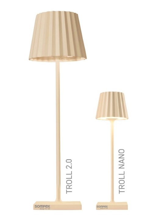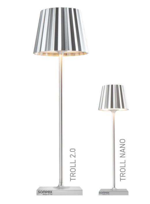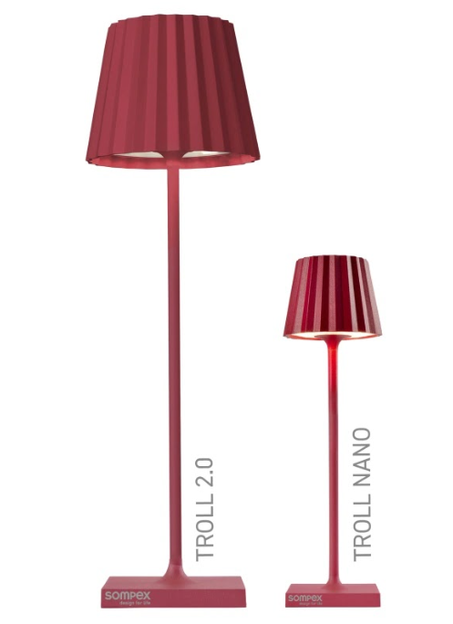 TROLL NANO – the small indoor & outdoor table lamp with the unique pleated shade. Made of aluminium and available in various colours, the TROLL NANO can be used indoors and outdoors. The powerful rechargeable battery provides up to 52 hours of cordless light. The touch sensor on the top of the luminaire can be used to dim the light continuously and to choose between two warm white light colours. The TROLL NANO can be recharged in the blink of an eye via the supplied charging station.