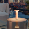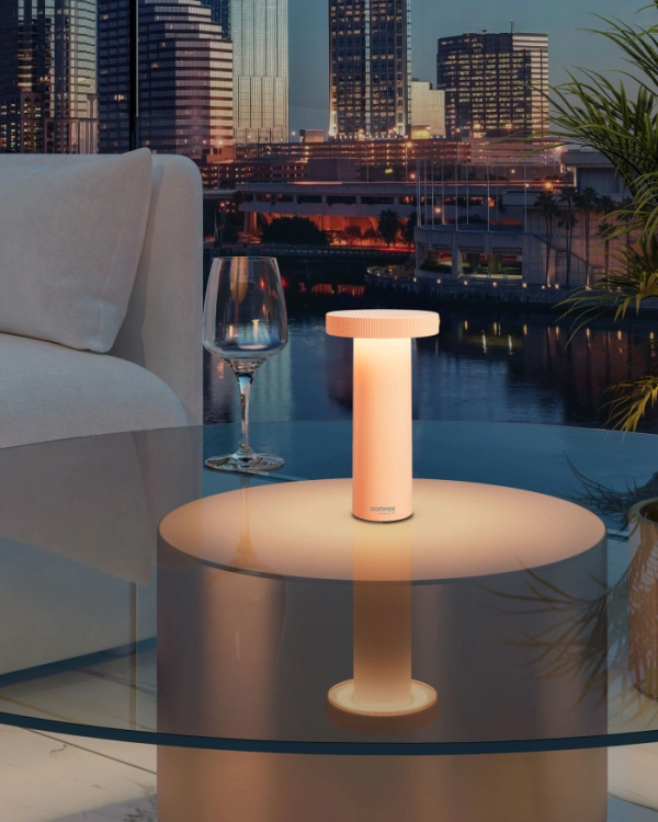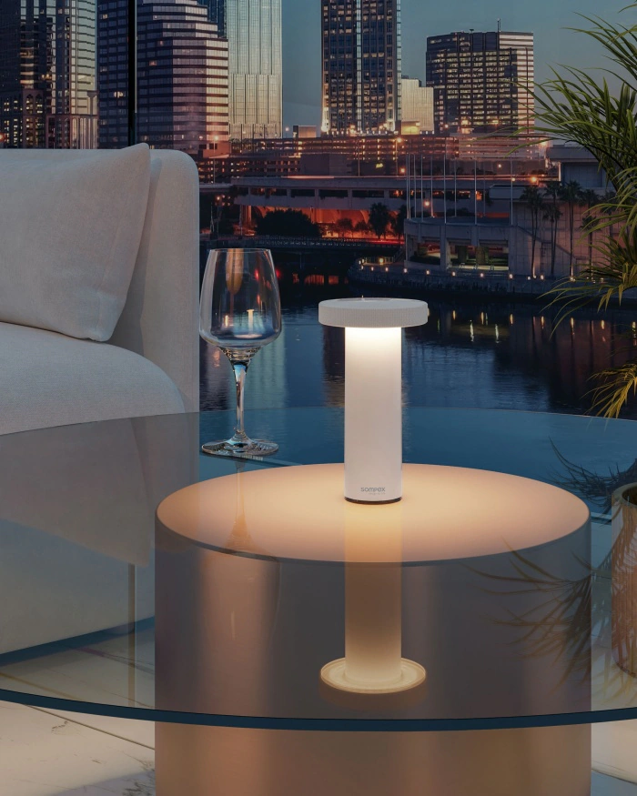 Sompex Volume: sleek black rechargeable table lamp with dimmable LED, 3 warm color temperatures (2200K-3000K), intuitive touch & twist control, minimalist retro design. 10-170h runtime, 6.5h charge. Cordless, portable elegance.